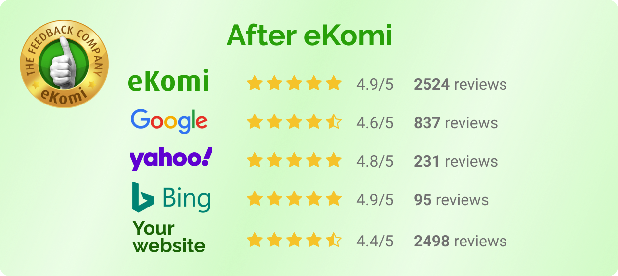 eKomi delivers more and better Ratings & Reviews for your local Google Maps/MyBusiness listing or any other review platform, than you have ever received before!